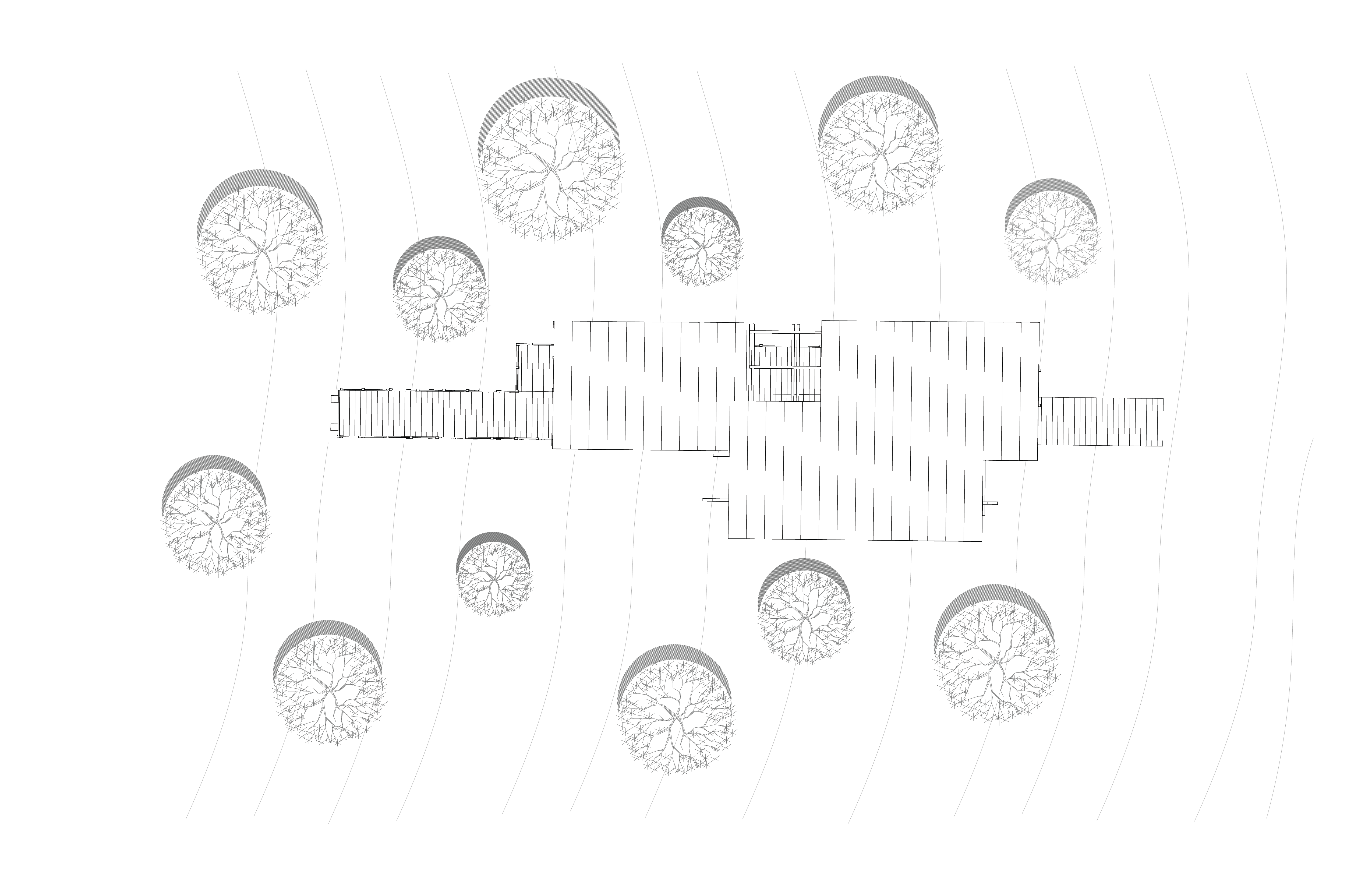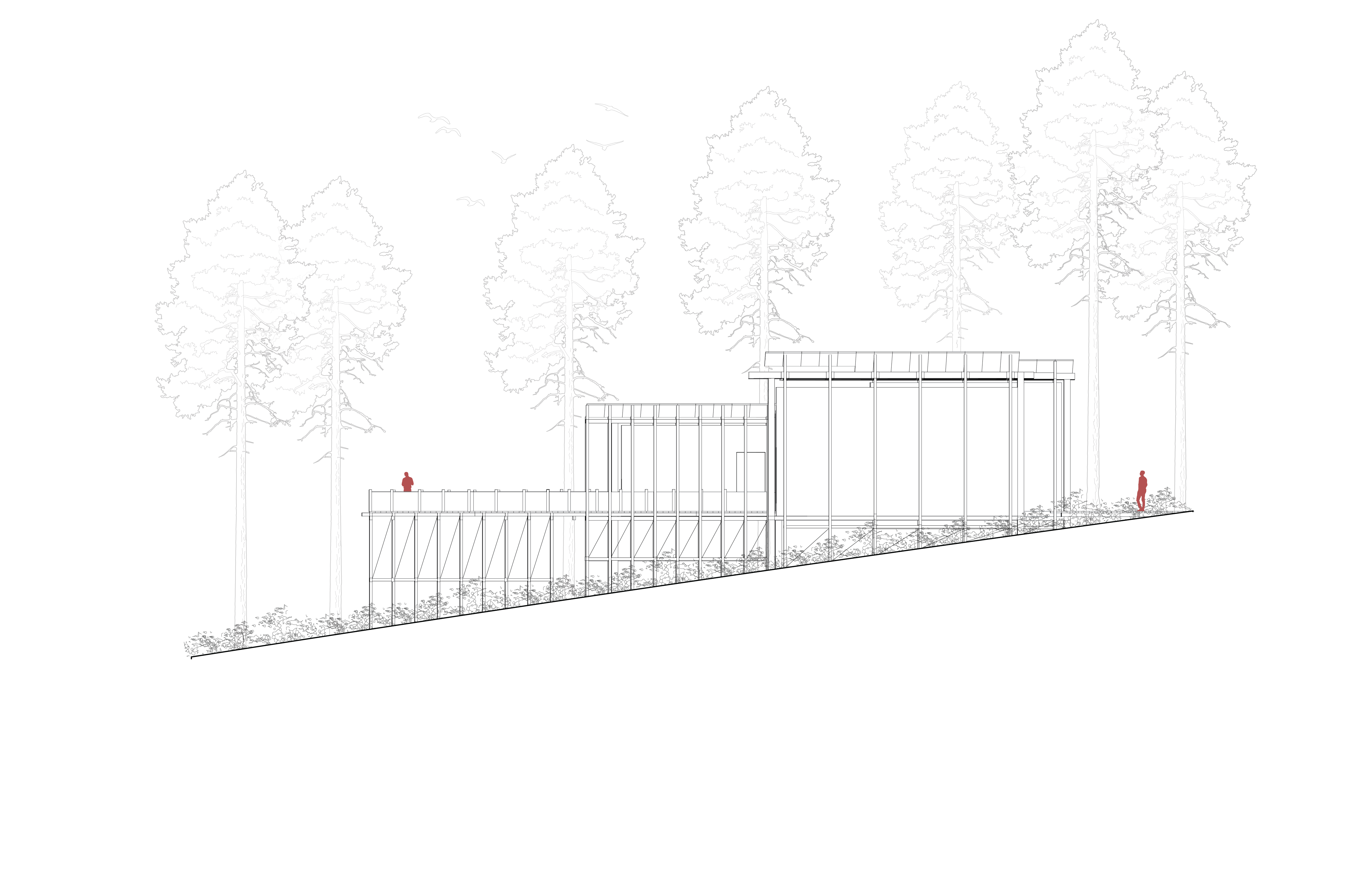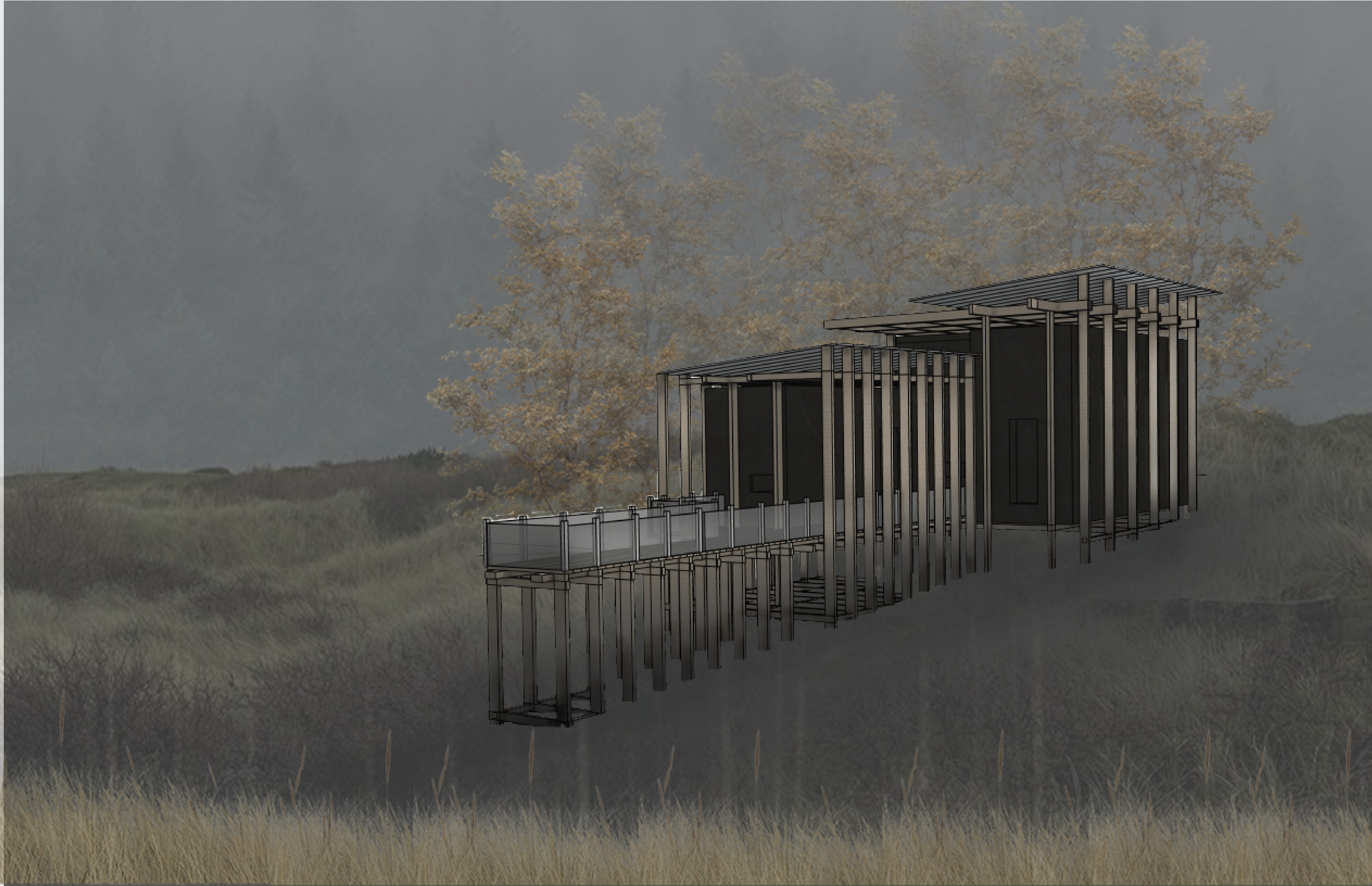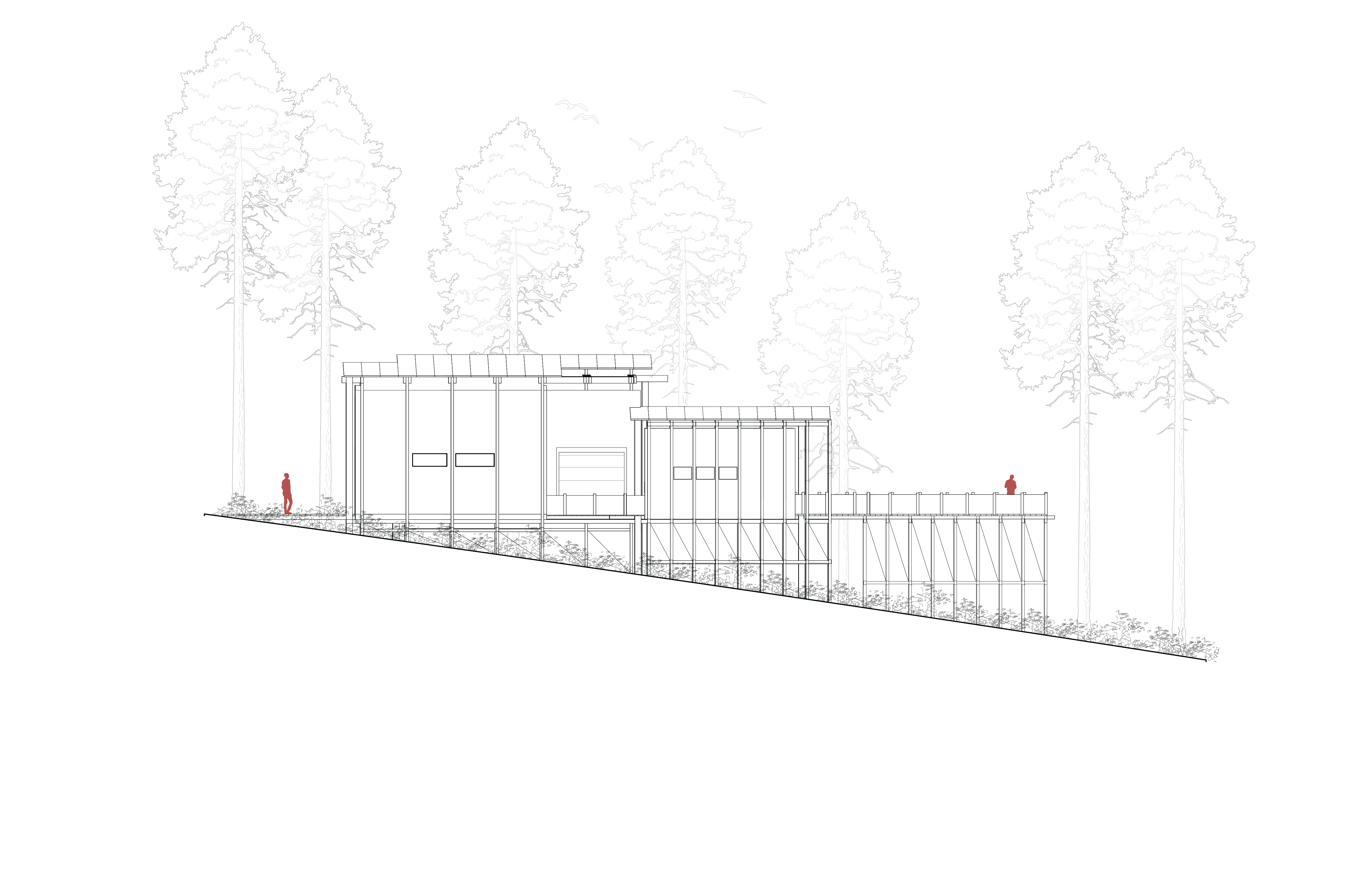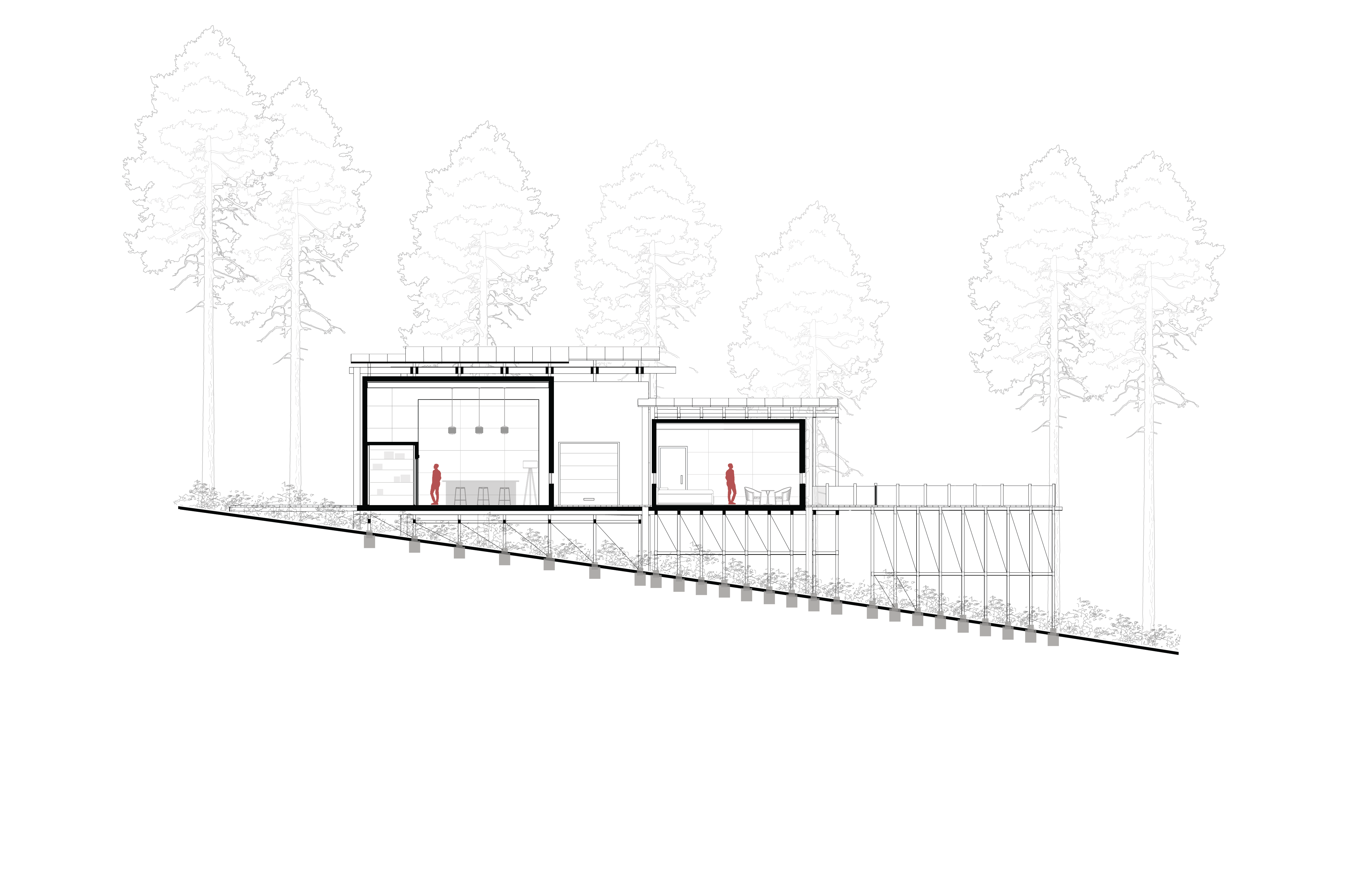 The Linear Retreat cabin is grounded along a central axis in the form of a spanning deck that reaches into the surrounding woods. A grid is formed by linear and horizontal beams that are both structural and aesthetic. The central mass houses the basic spaces, kitchen, dinning, and living, while a separate suspended rectilinear space is constructed further out on the axis. The intention behind this is to further immerse the individual in nature and creating intimacy.