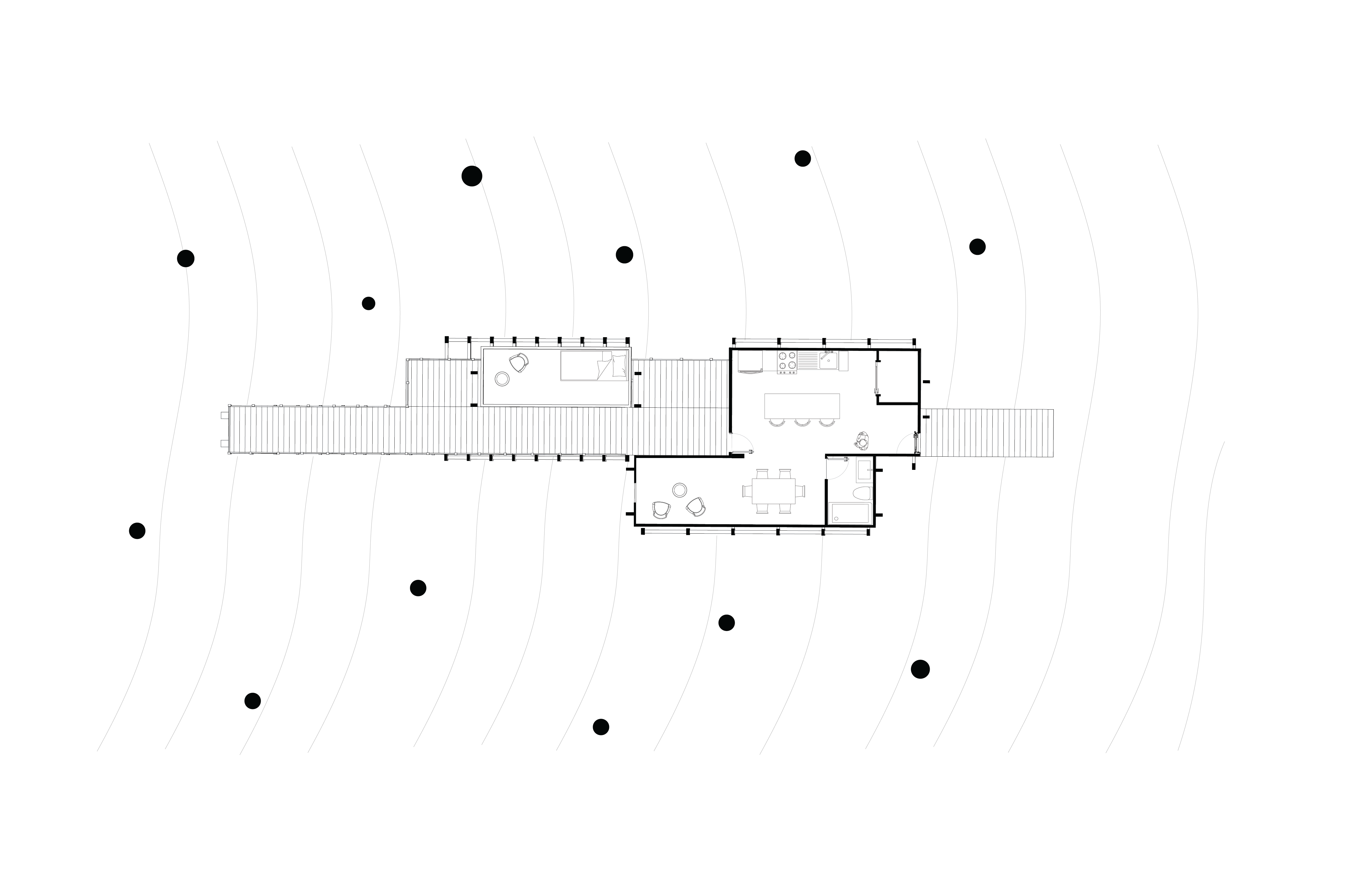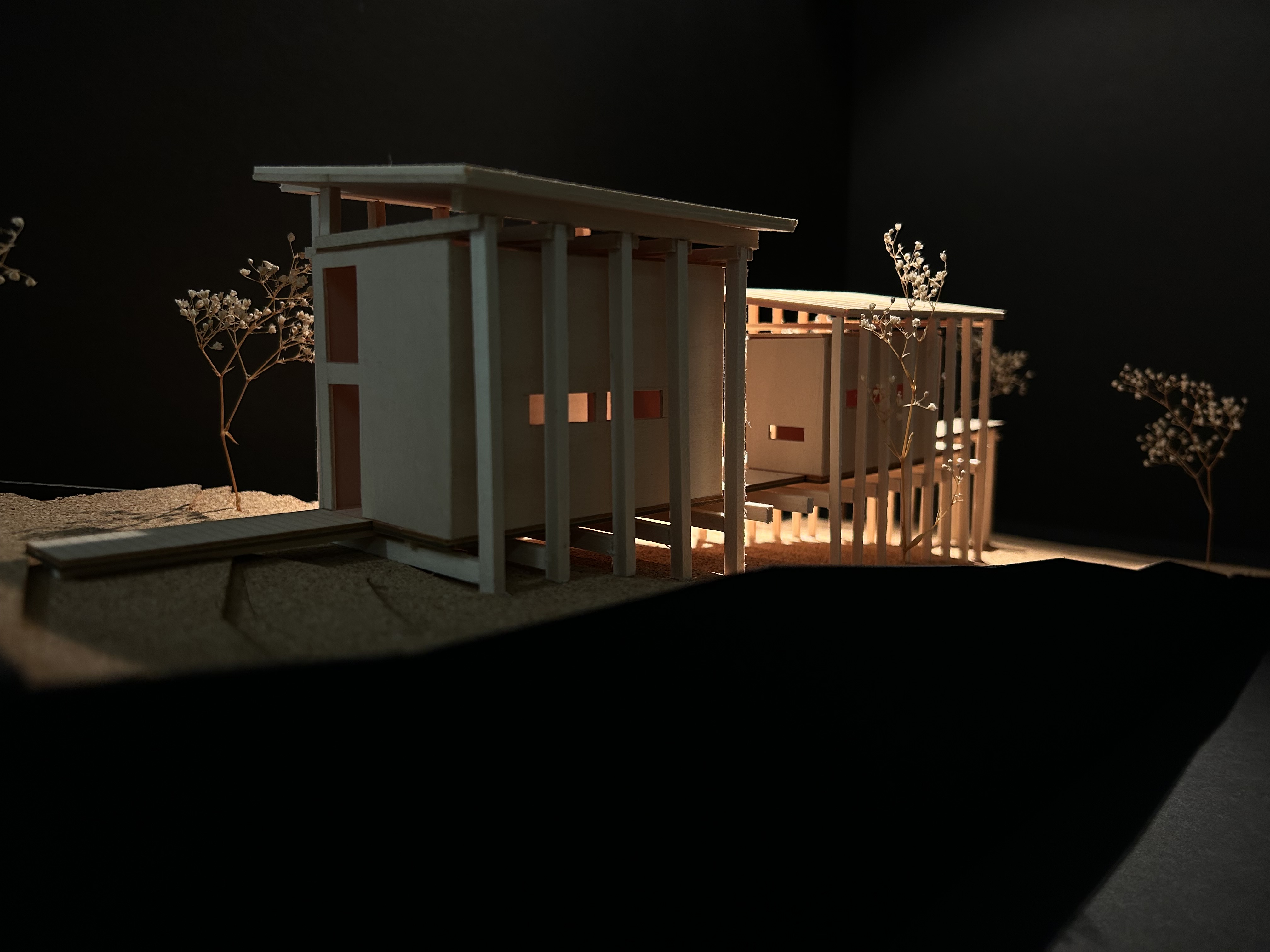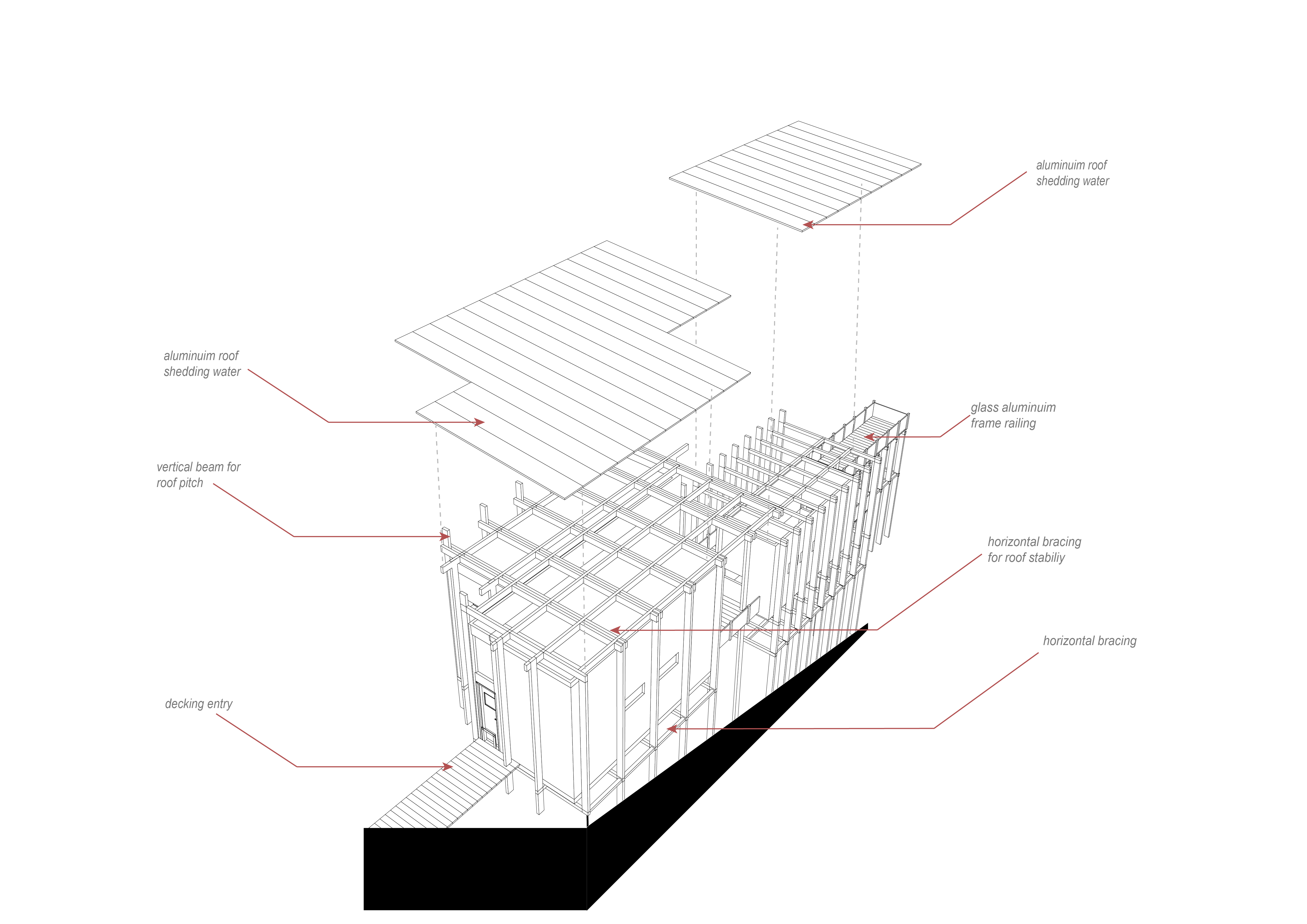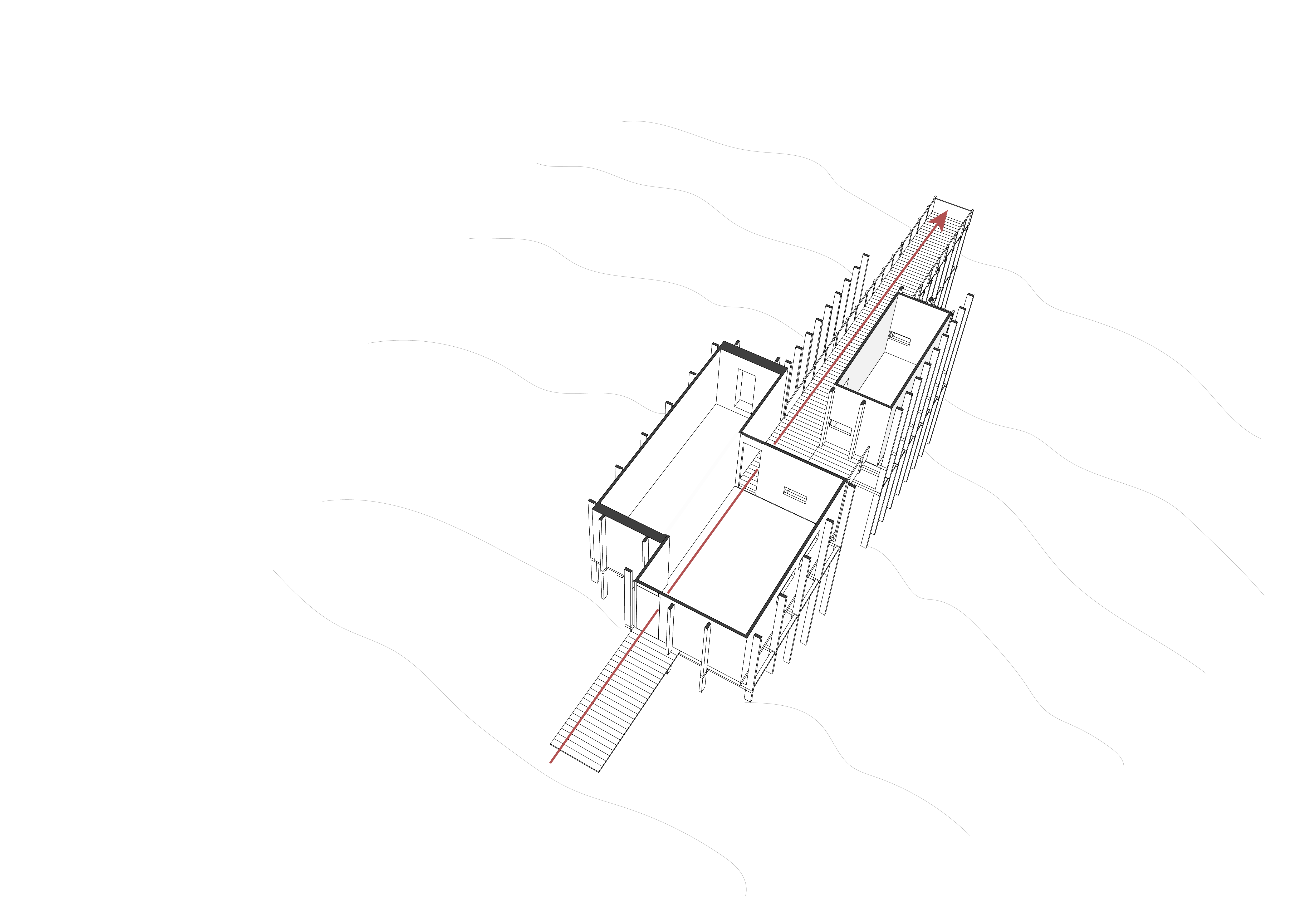 The Linear Retreat cabin is grounded along a central axis in the form of a spanning deck that reaches into the surrounding woods. A grid is formed by linear and horizontal beams that are both structural and aesthetic. The central mass houses the basic spaces, kitchen, dinning, and living, while a separate suspended rectilinear space is constructed further out on the axis. The intention behind this is to further immerse the individual in nature and creating intimacy.