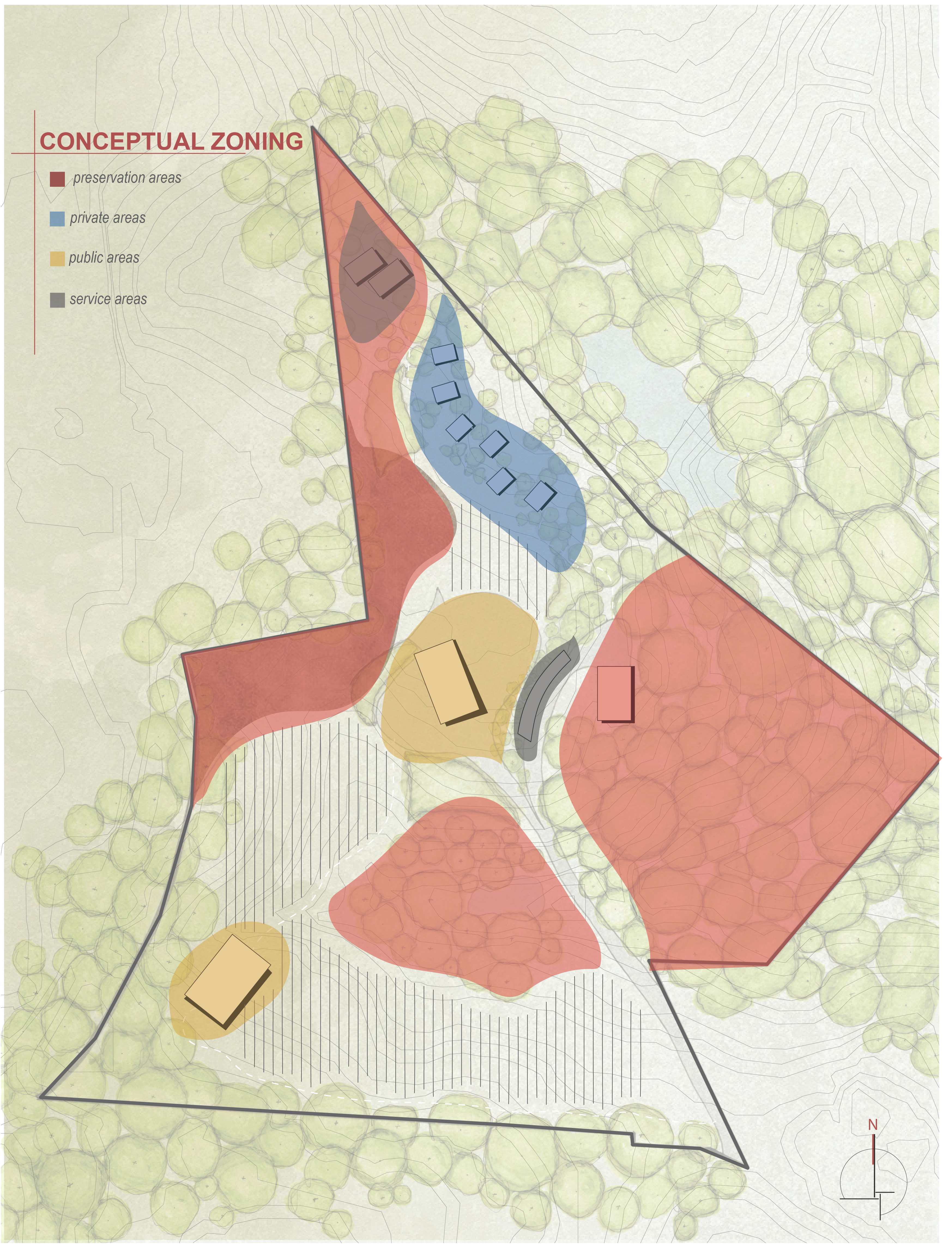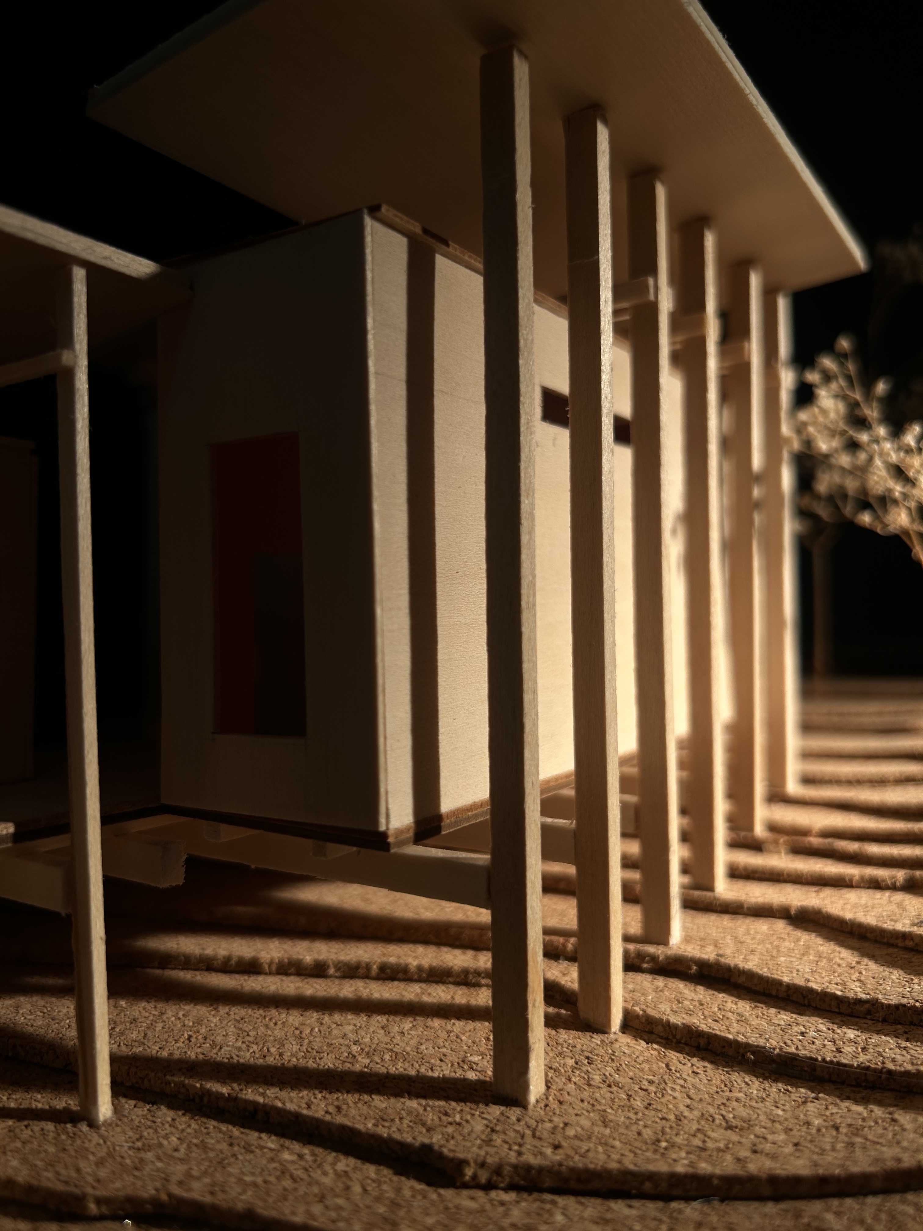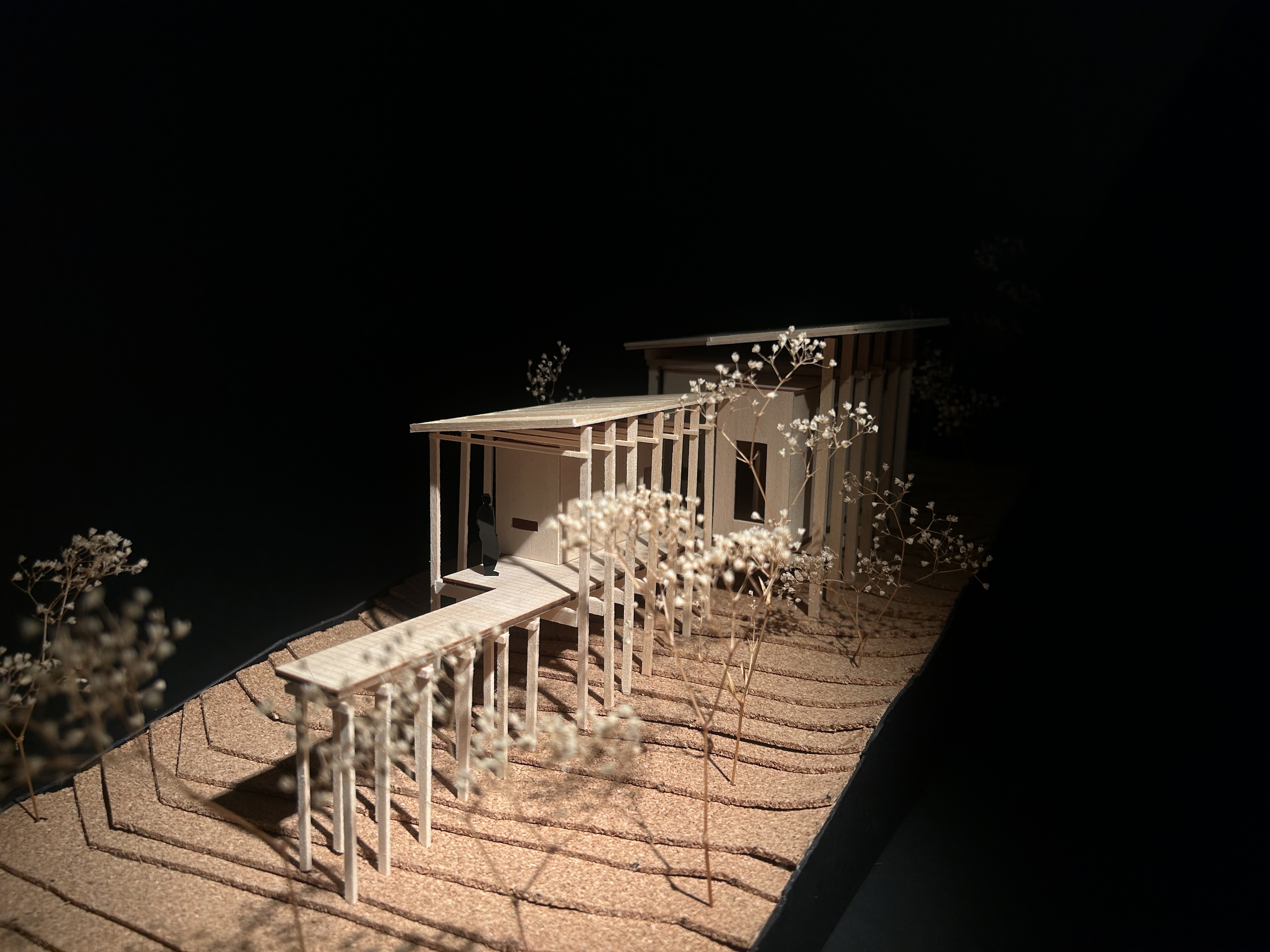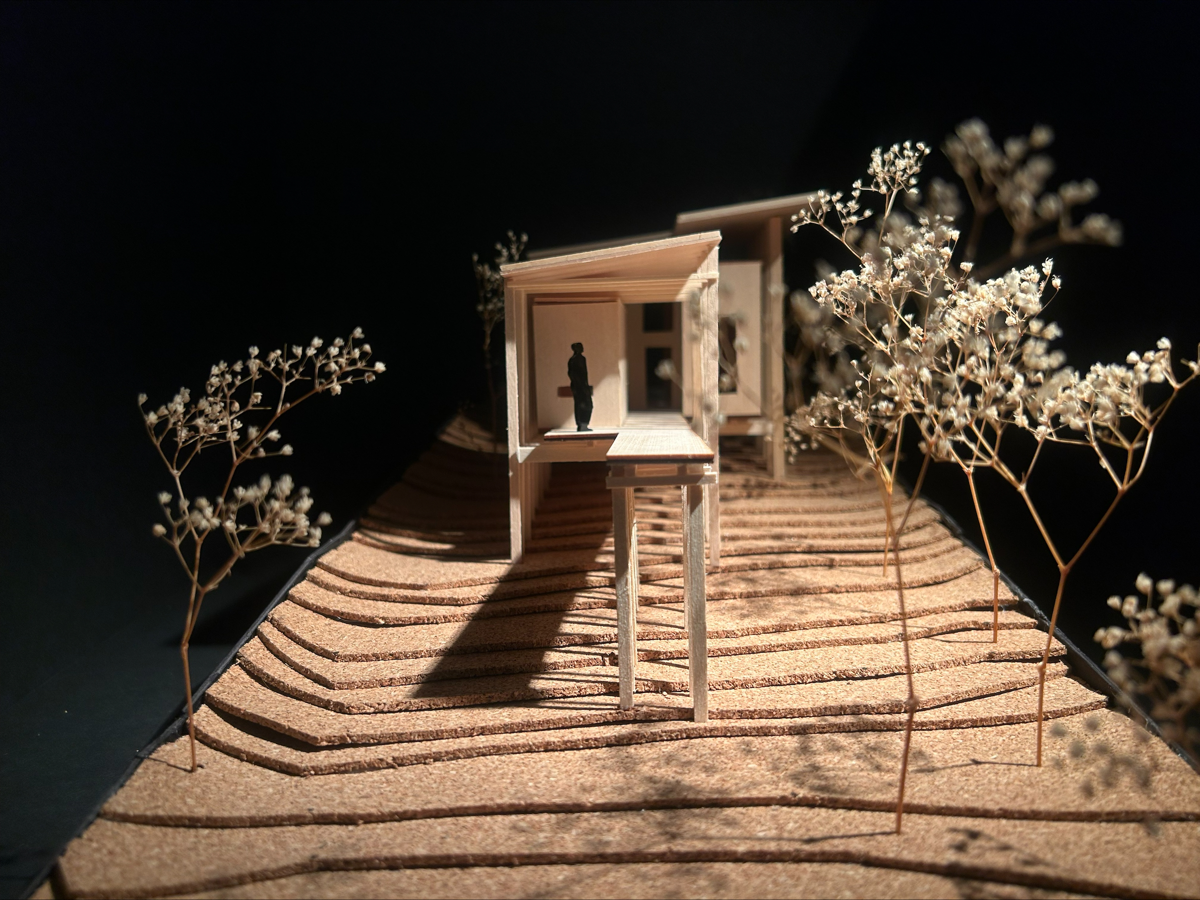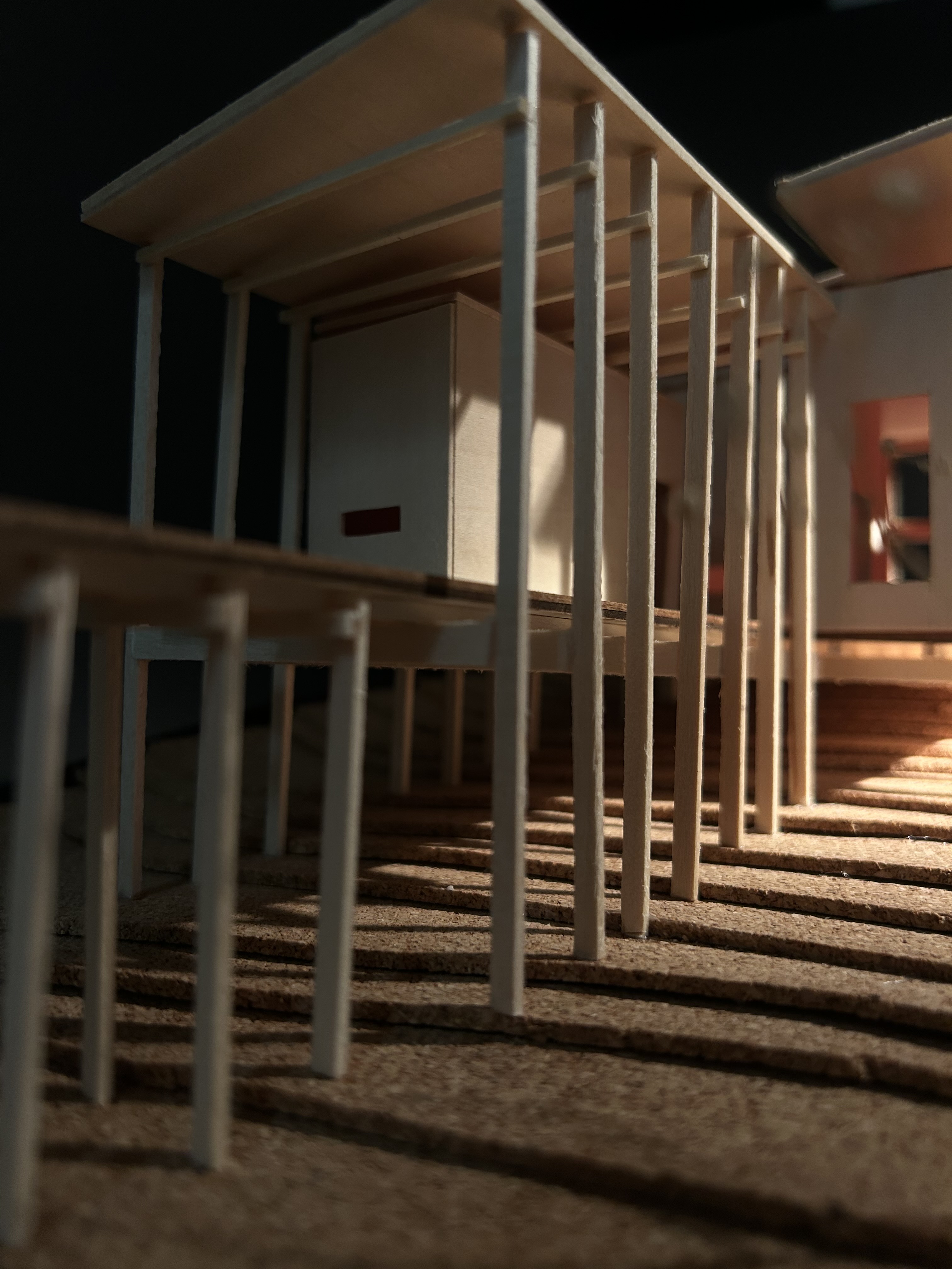 The Linear Retreat cabin is grounded along a central axis in the form of a spanning deck that reaches into the surrounding woods. A grid is formed by linear and horizontal beams that are both structural and aesthetic. The central mass houses the basic spaces, kitchen, dinning, and living, while a separate suspended rectilinear space is constructed further out on the axis. The intention behind this is to further immerse the individual in nature and creating intimacy.