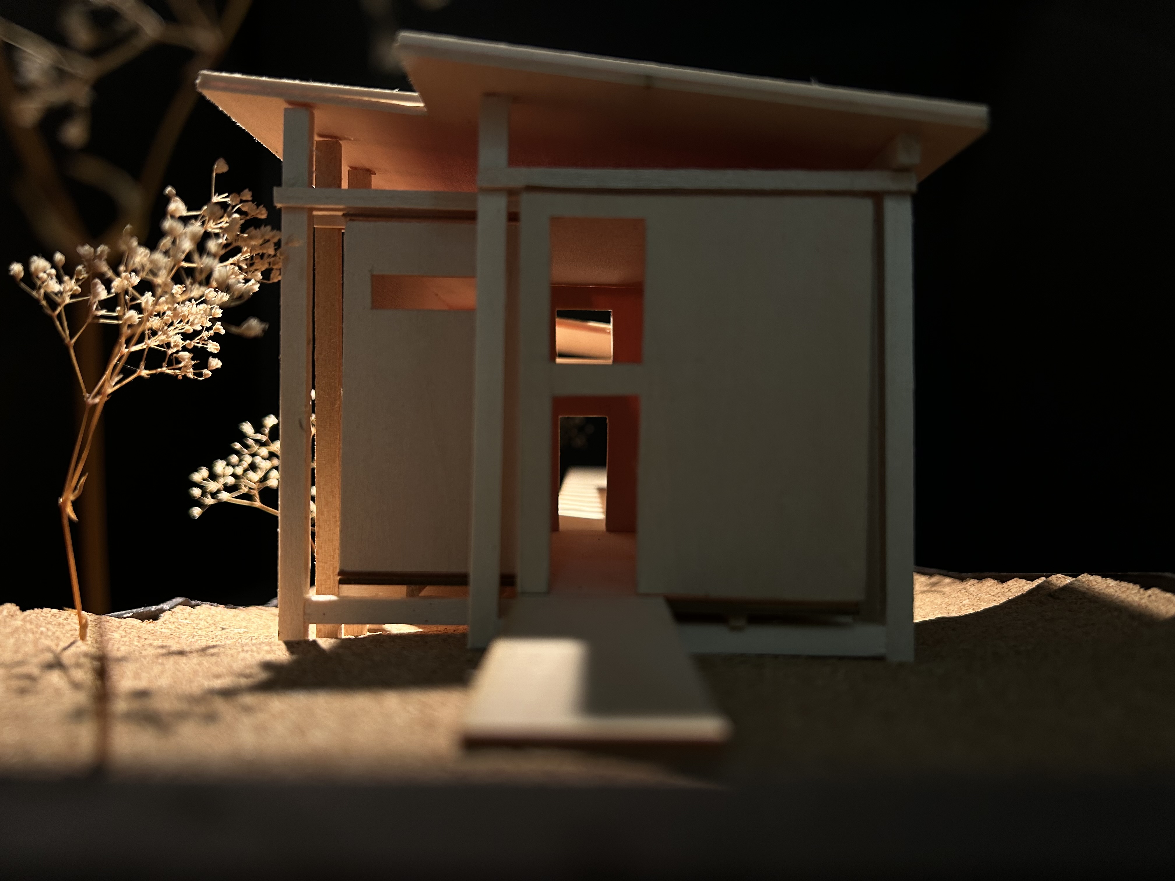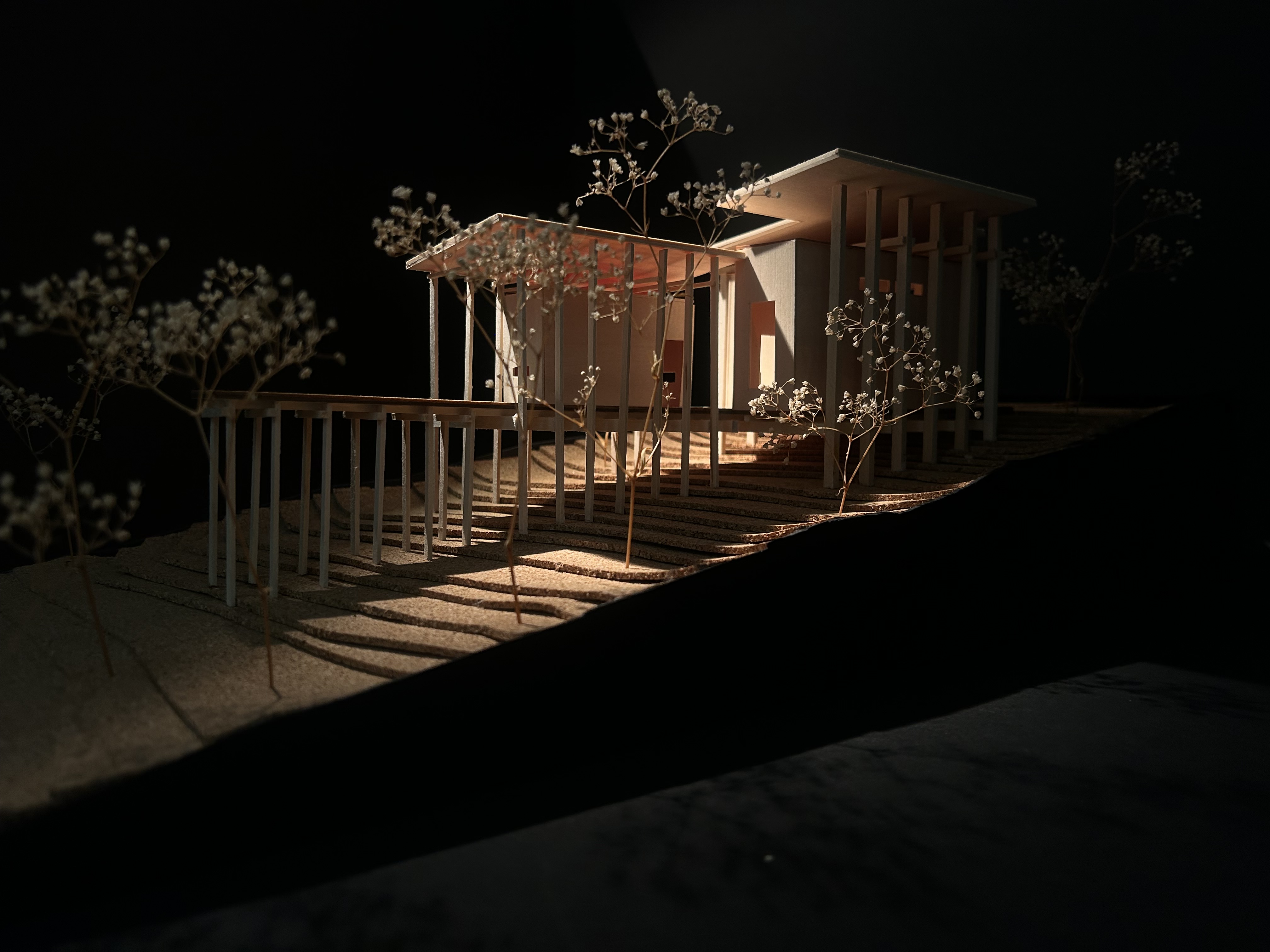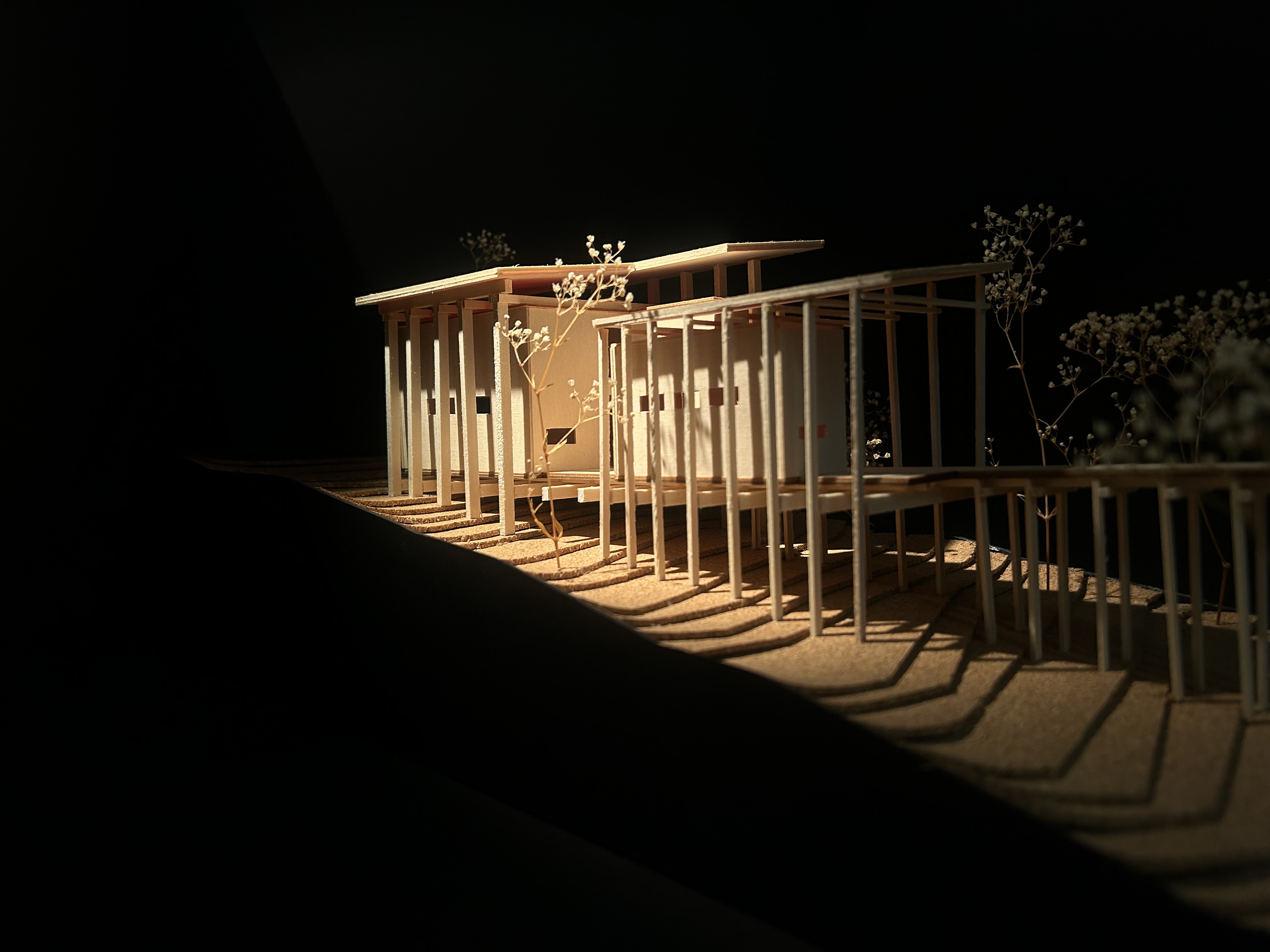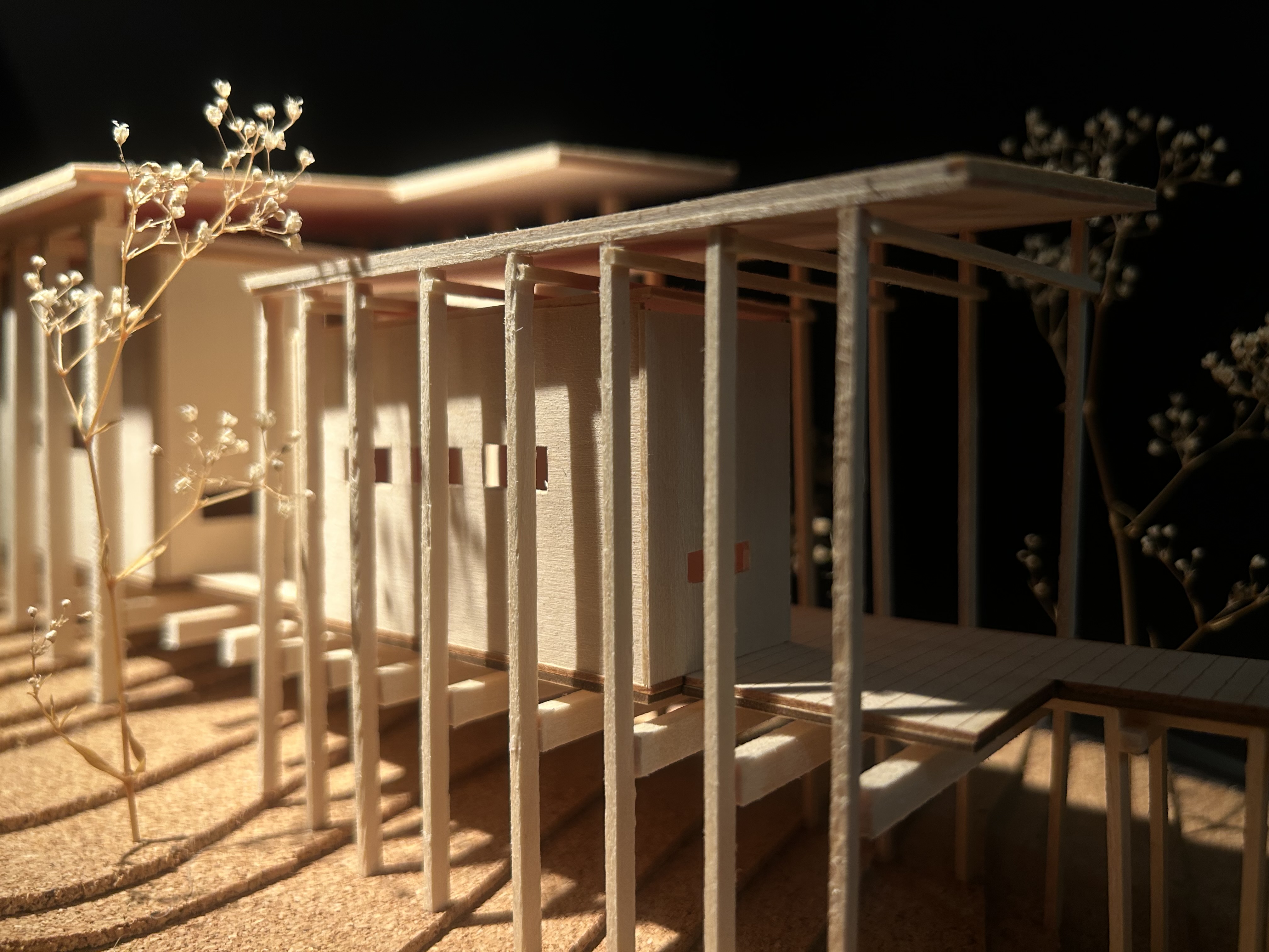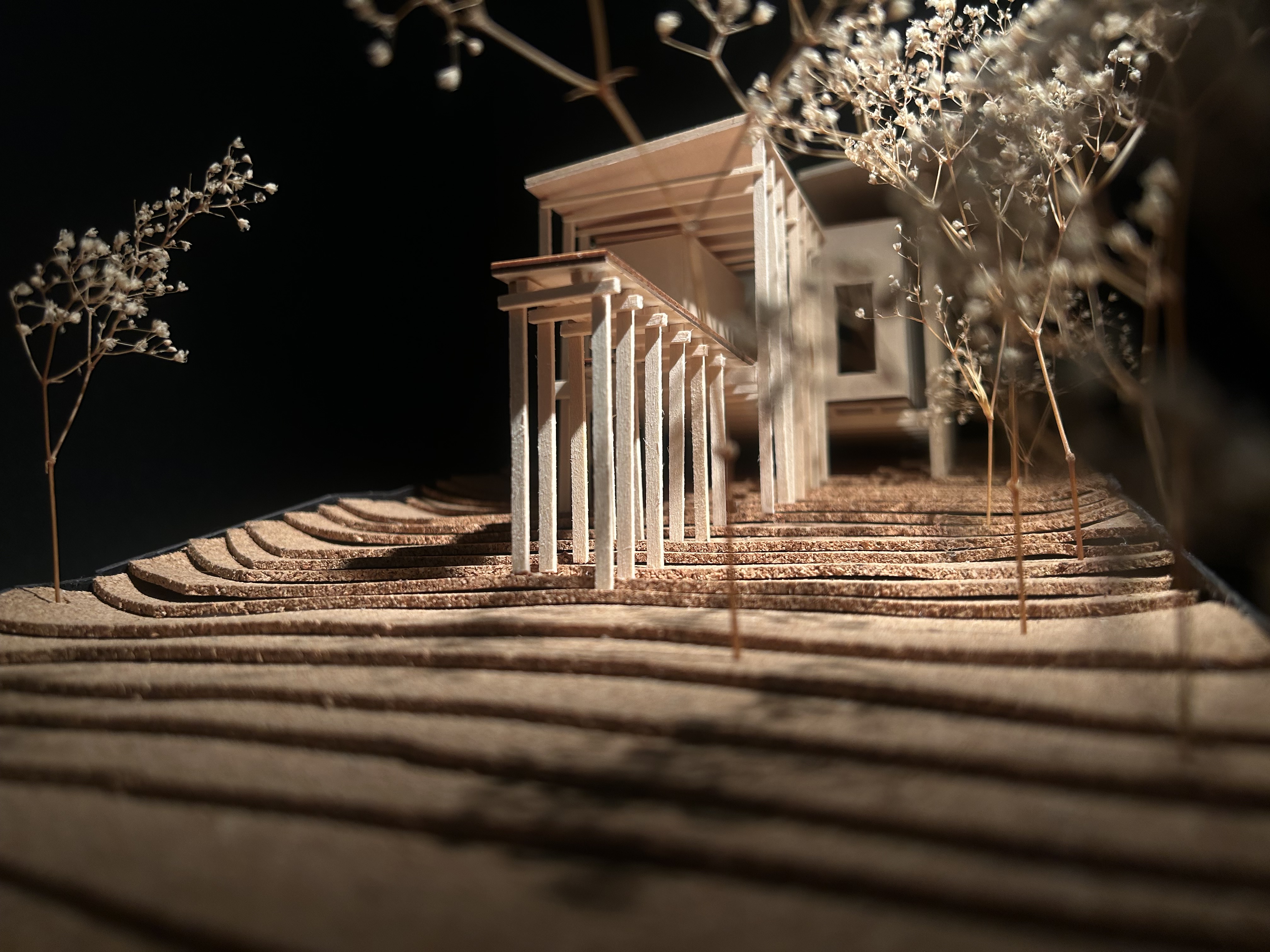 The Linear Retreat cabin is grounded along a central axis in the form of a spanning deck that reaches into the surrounding woods. A grid is formed by linear and horizontal beams that are both structural and aesthetic. The central mass houses the basic spaces, kitchen, dinning, and living, while a separate suspended rectilinear space is constructed further out on the axis. The intention behind this is to further immerse the individual in nature and creating intimacy.